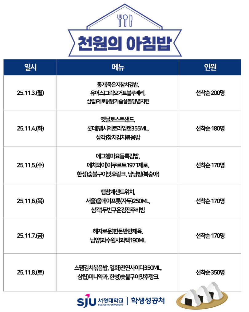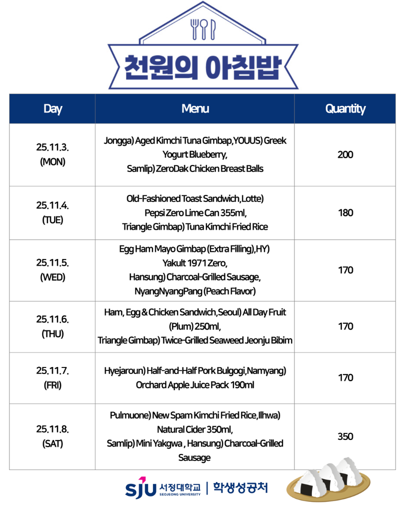 [식단표(천원의 아침밥)] 11월 1주 천원의 아침밥 메뉴 안내 N