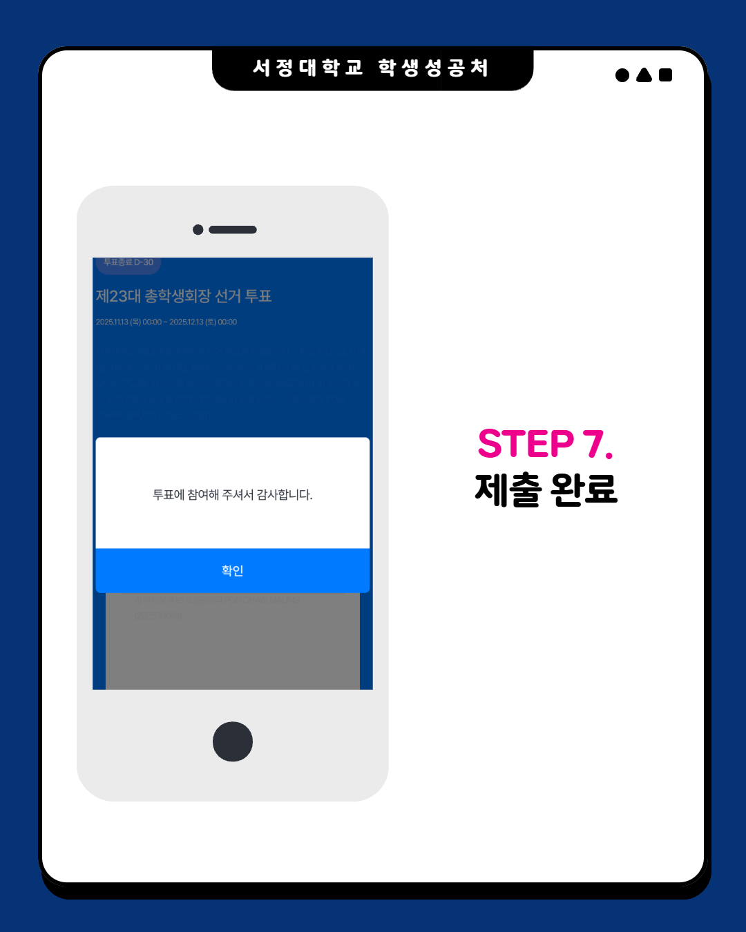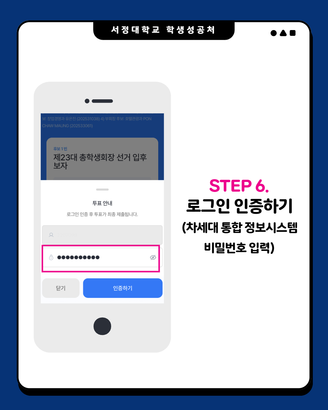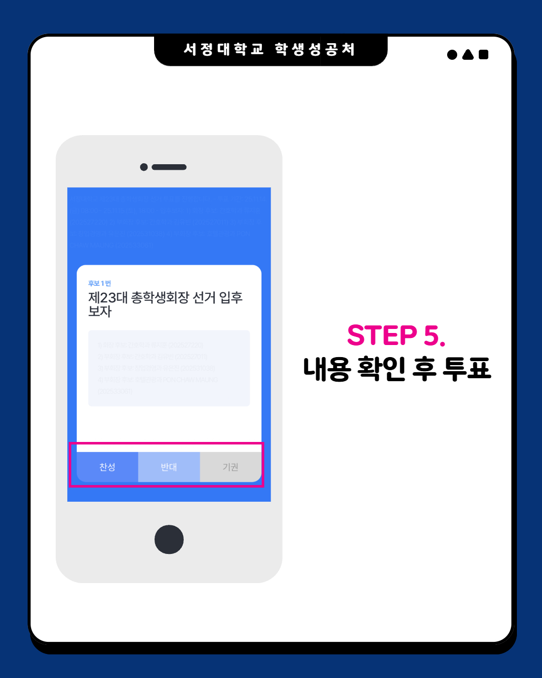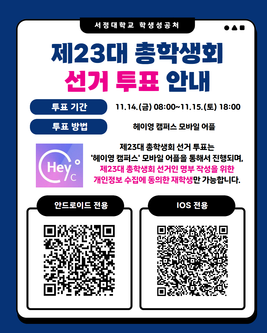 제23대 총학생회 선거 투표는 존에 진행하였던 선거인 명부 작성을 위한 개인정보 동의 절차 시 동의한 재학생만 참여 가능합니다.