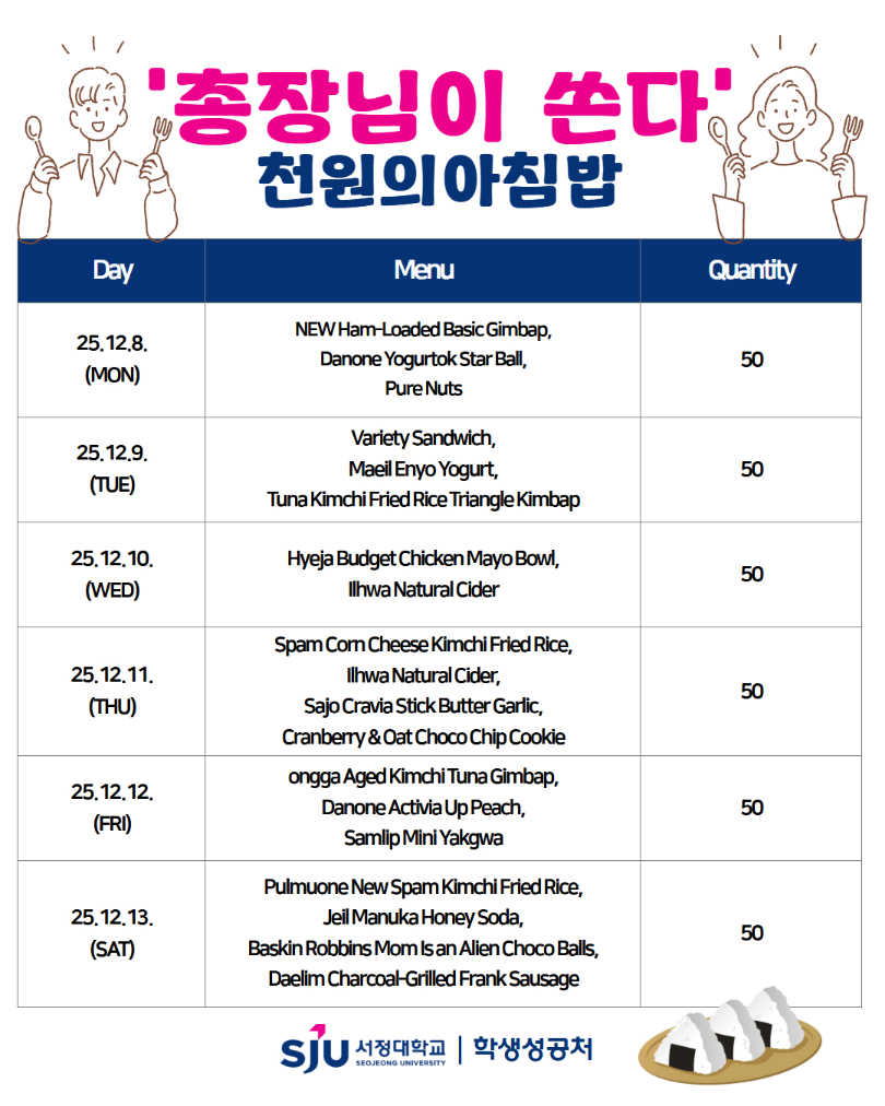 [식단표(천원의 아침밥)] '총장님이쏜다' 12월 2주 천원의 아침밥 메뉴 안내 N